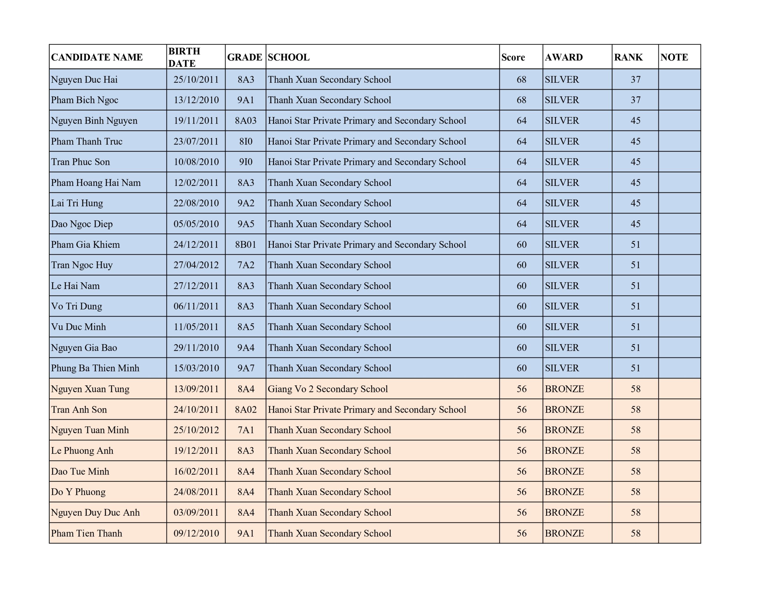 Bảng thành tích cấp độ B (Lớp 10 – 11 – 12)