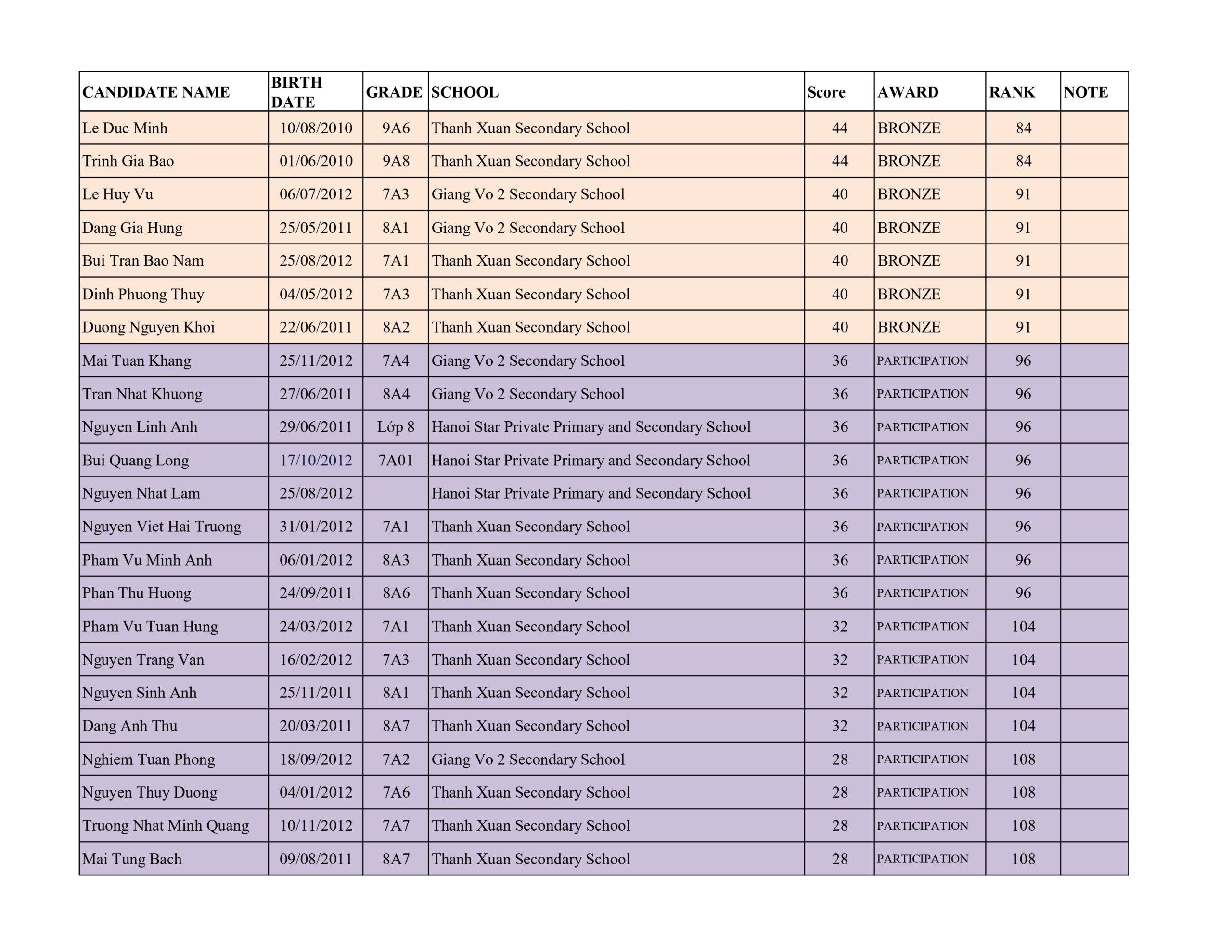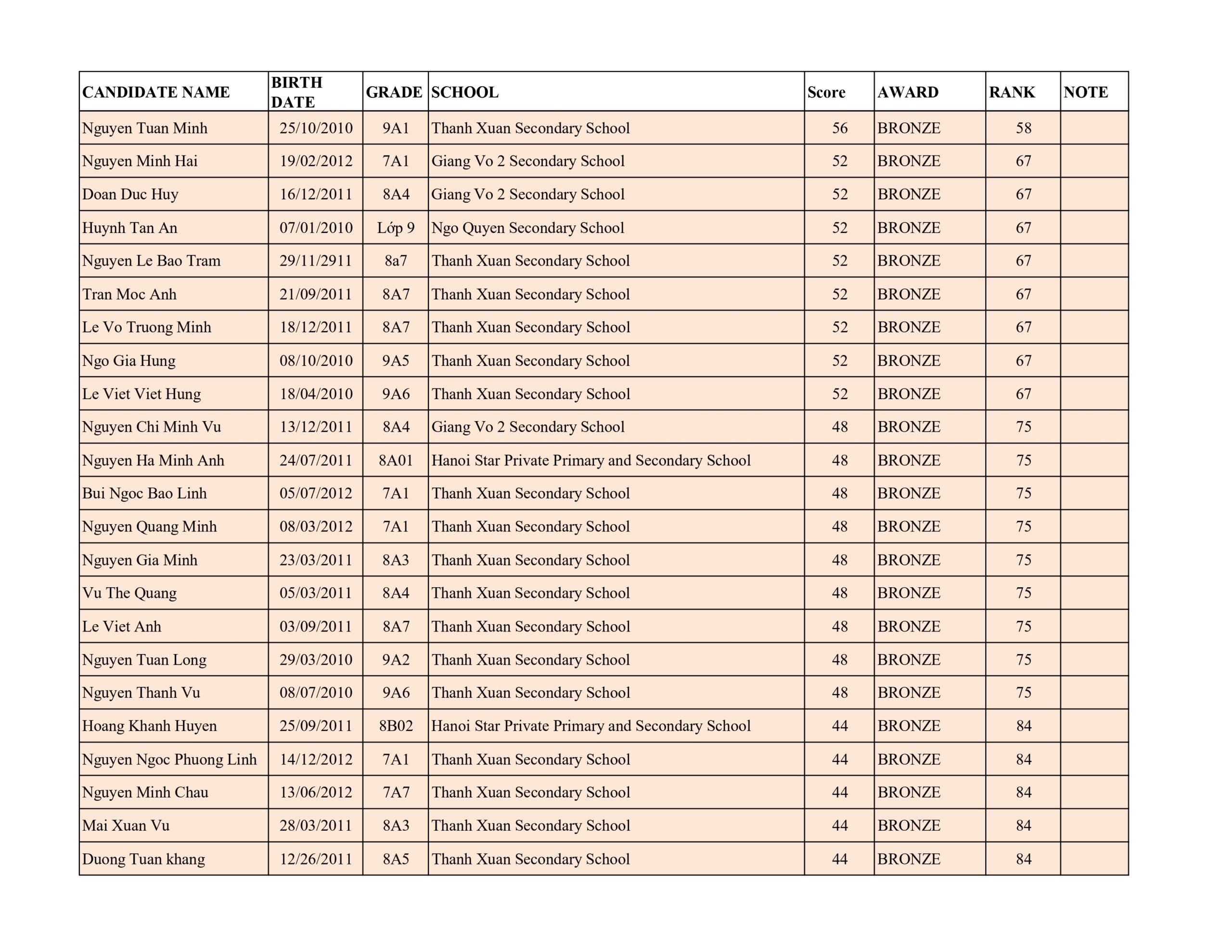 Bảng thành tích cấp độ A lớp 7 – 8 – 9: